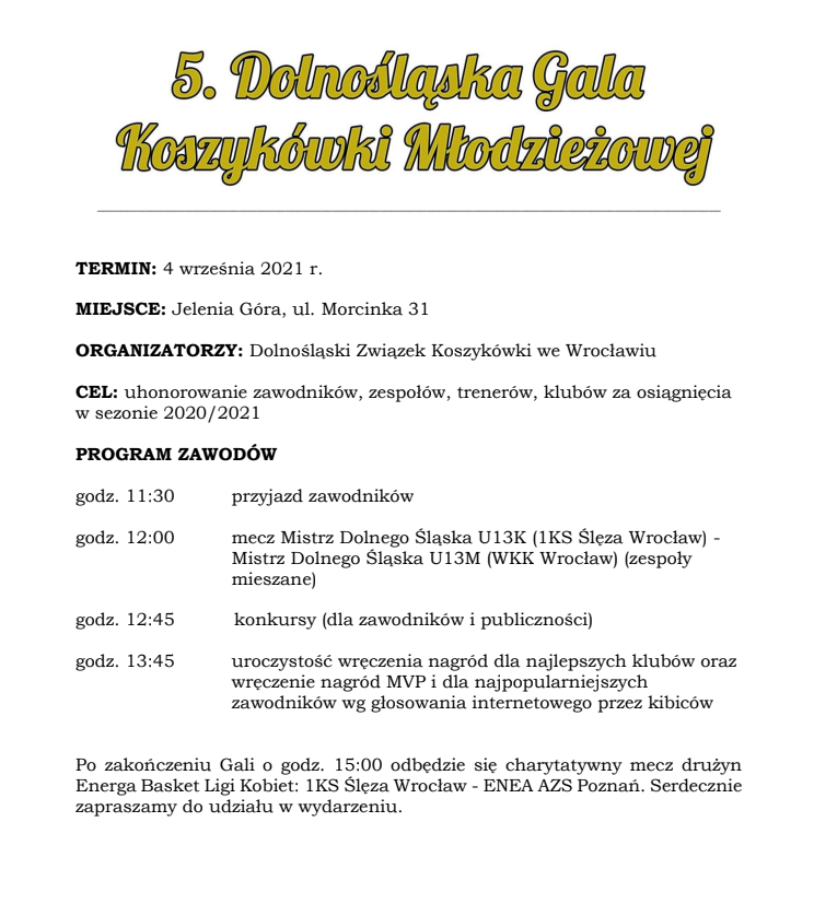zapraszamy na 5. Galę Dolnośląskiej Koszykówki Młodzieżowej (Jelenia Góra, 4.09.2021 r.). Podczas wydarzenia rozegrany zostanie mecz Mistrzów Dolnego Śląska U13, przeprowadzane będą konkursy dla zawodników i publiczności oraz wręczone nagrody dla MVP oraz klubów.