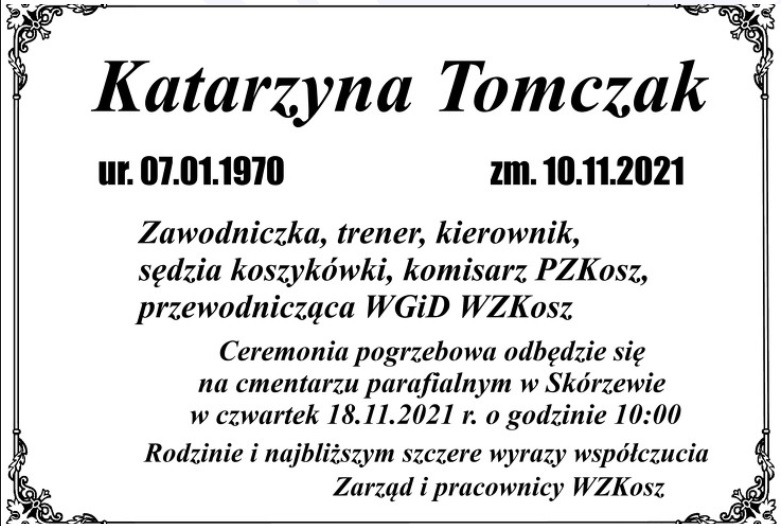 Z przykrością informujemy, że w dniu 10.11.2021 r. odeszła Katarzyna Tomczak - zawodniczka, trener, sędzia koszykówki, komisarz PZKosz i przewodnicząca WGiD WZKosz.